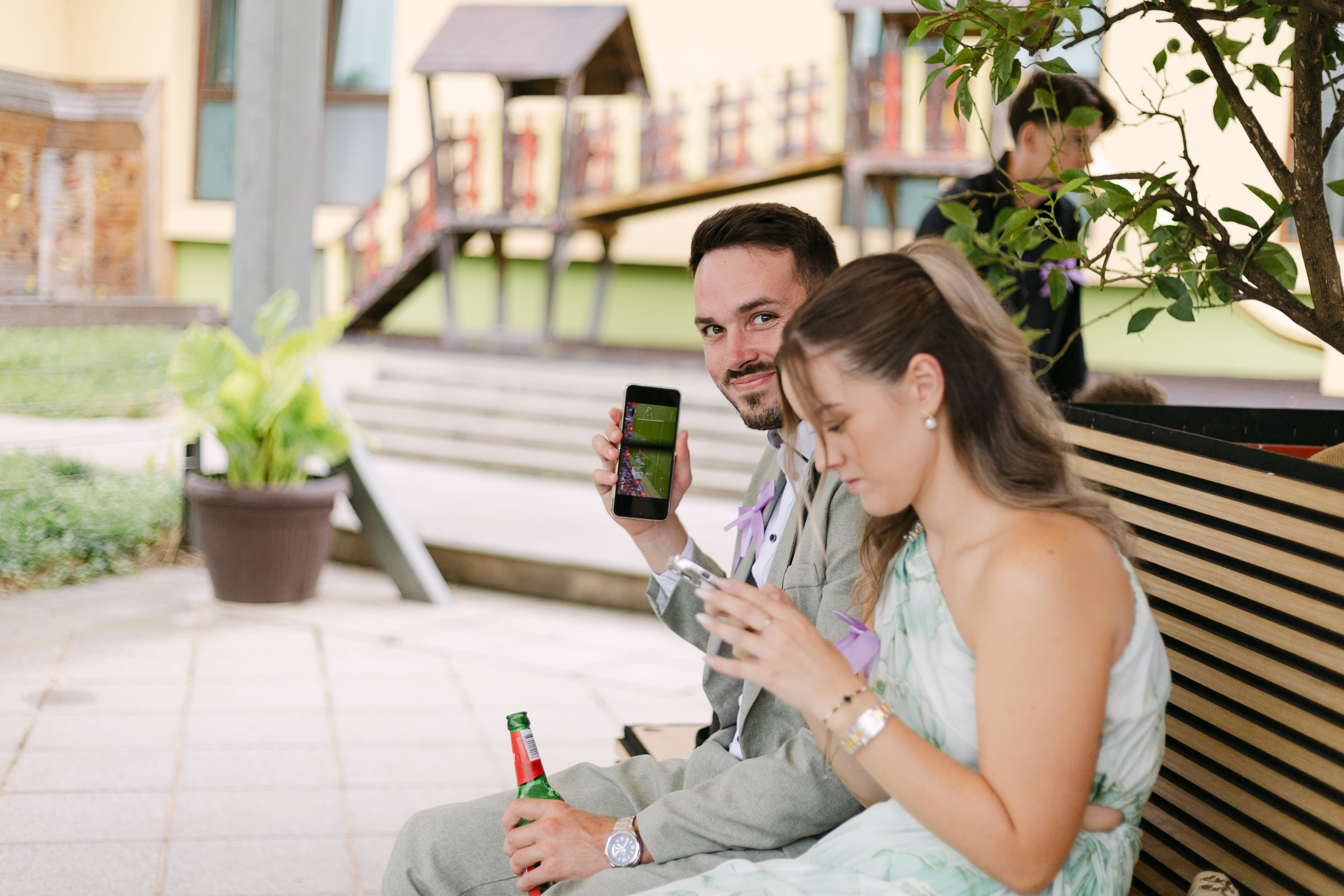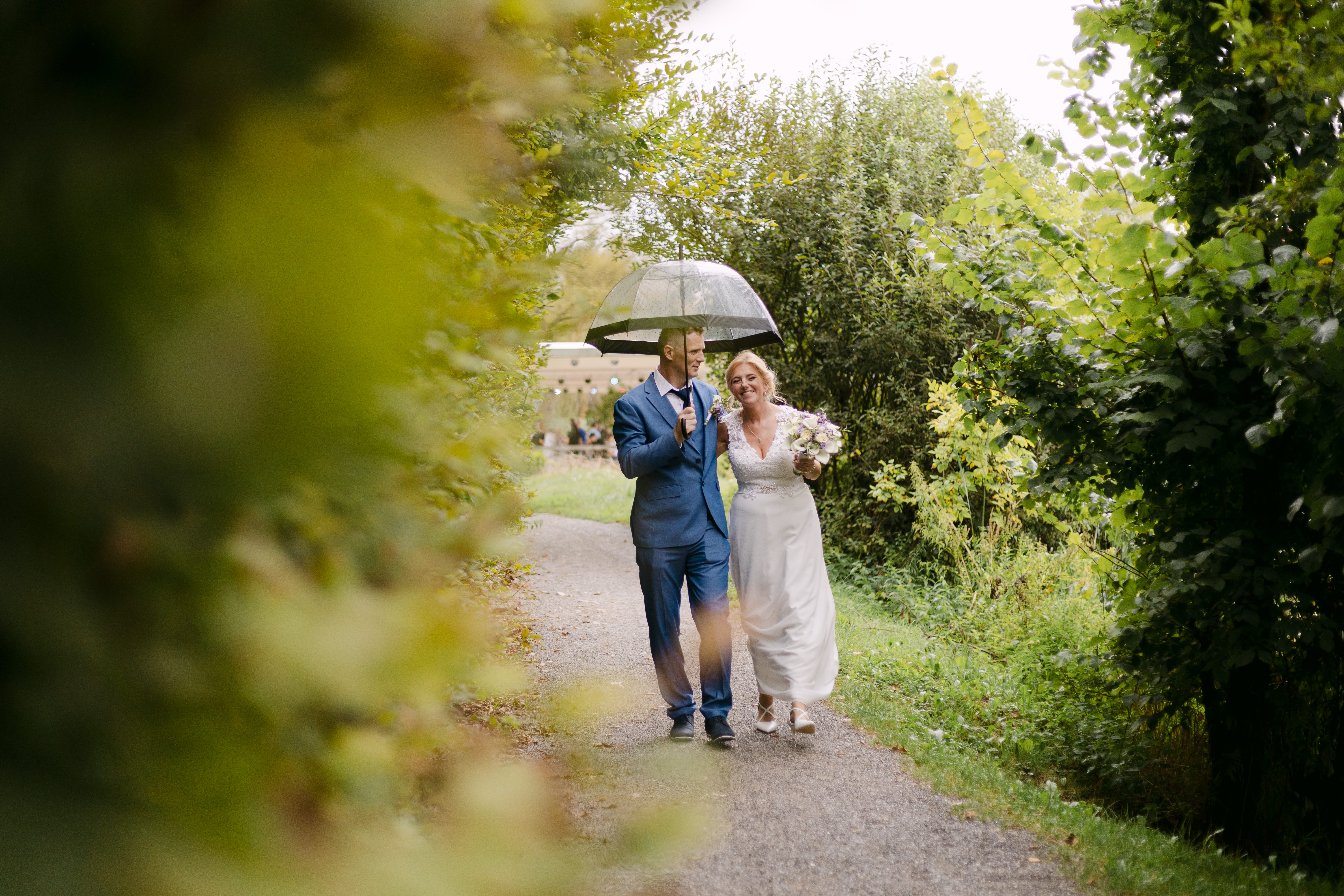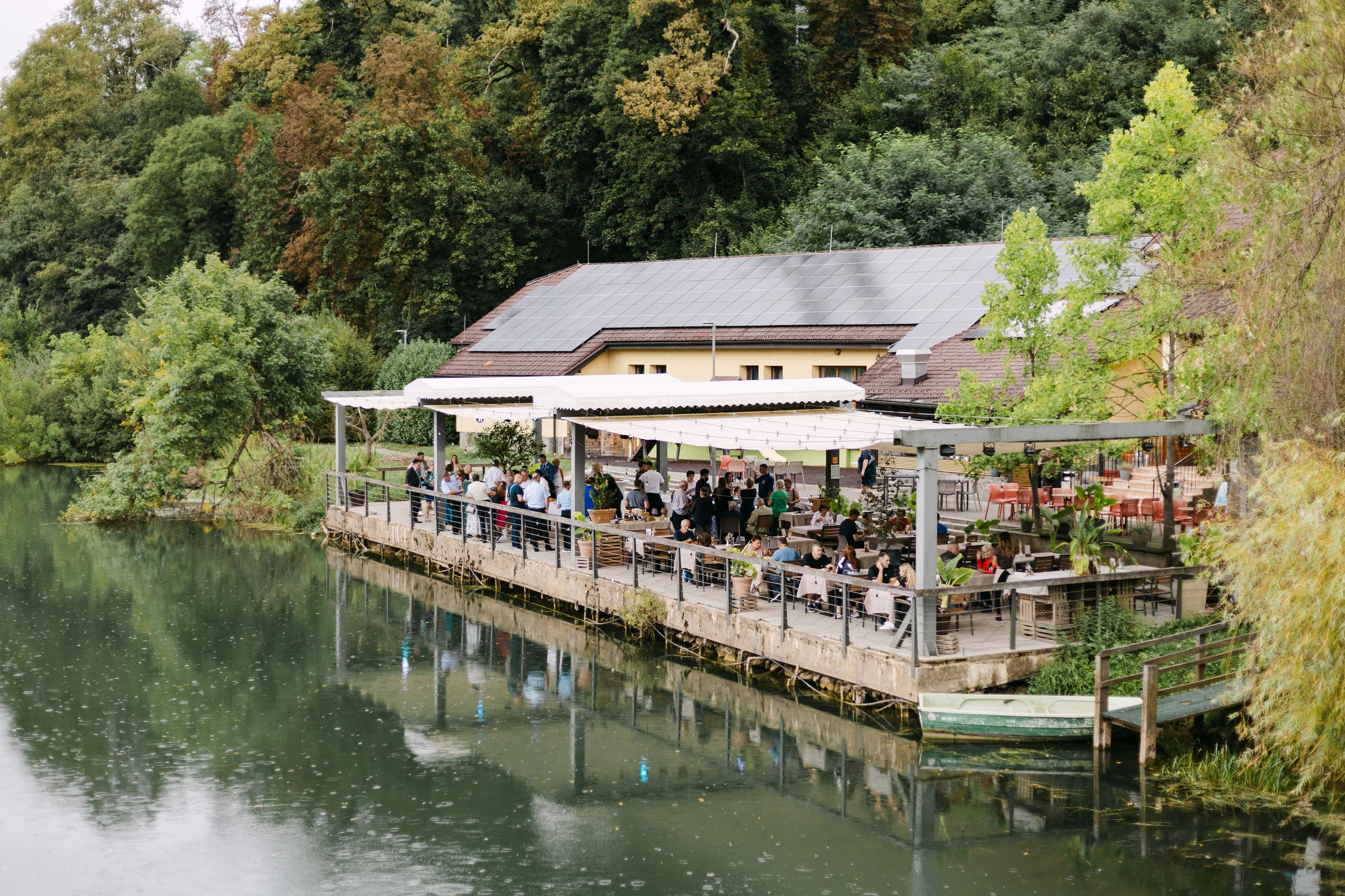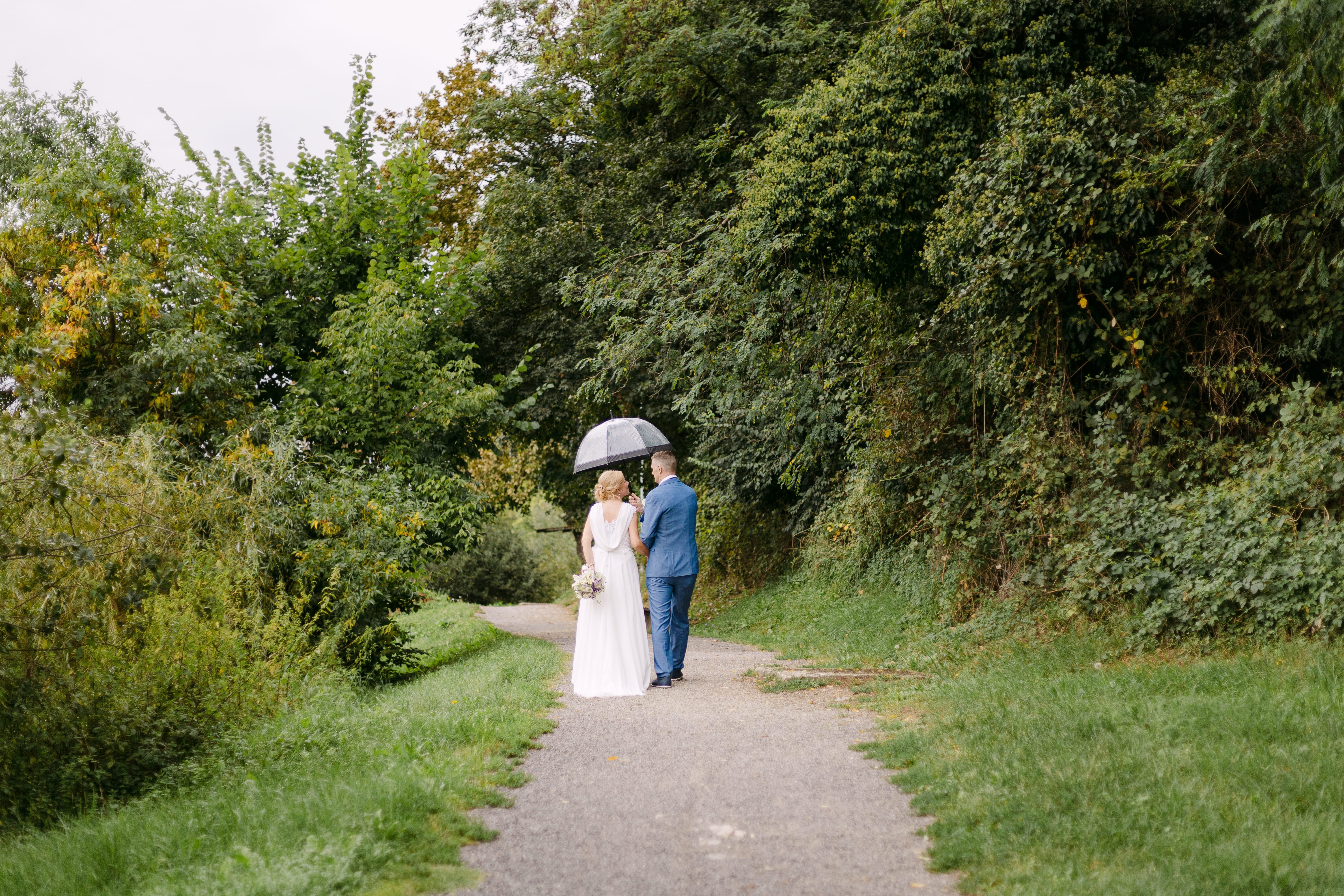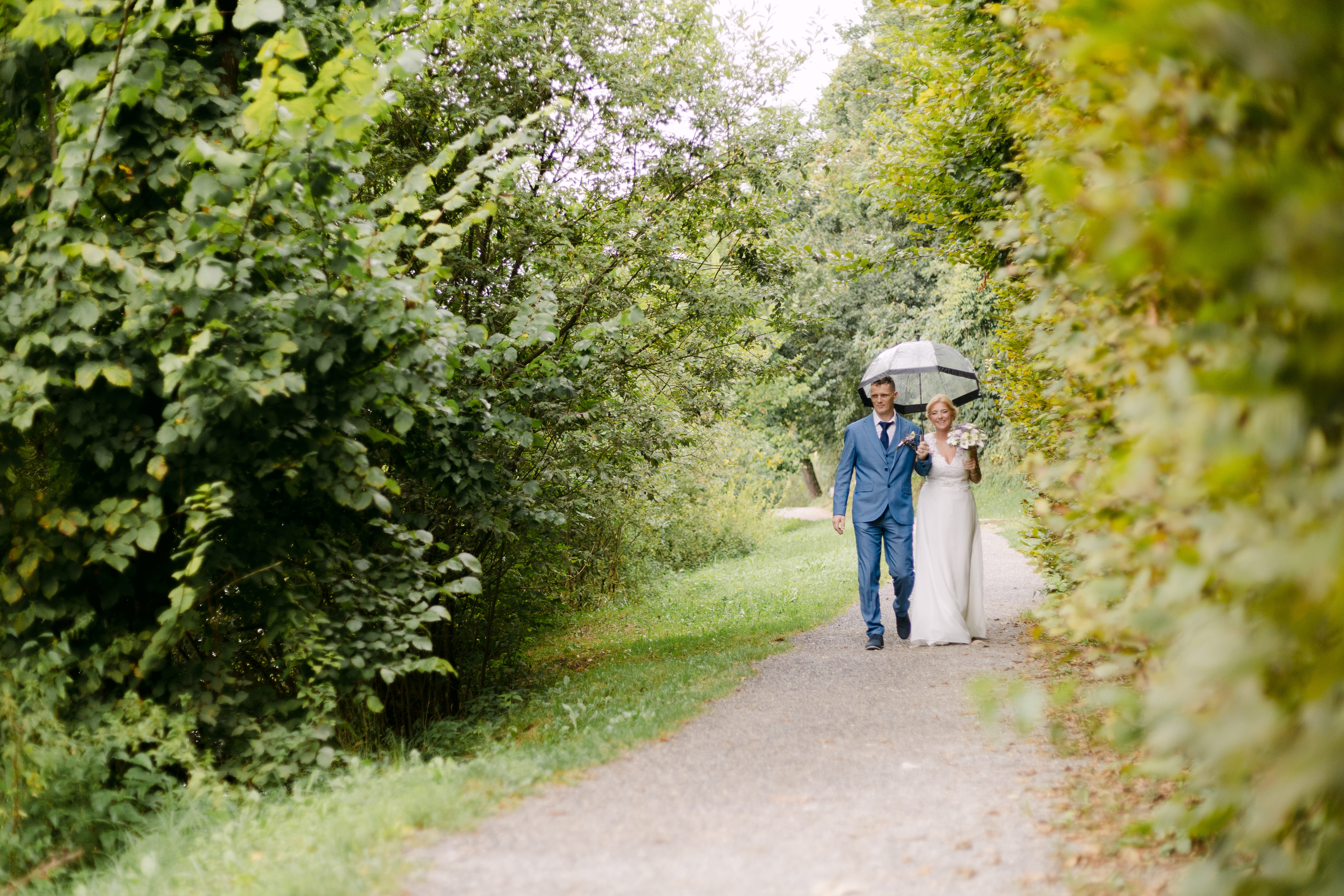 Nato smo se odpravili proti Gostišču Loka, ki leži tik ob reki Krki. Ta kraj ima res posebno energijo – mir, zelenje in voda ustvarijo popolno kuliso za poročno fotografiranje. Po okusni pogostitvi smo izkoristili romantično sprehajalno pot ob reki za nekaj zasebnih portretov, dokler nas ni presenetil poletni naliv. A tudi to je dalo dnevu svoj čar.